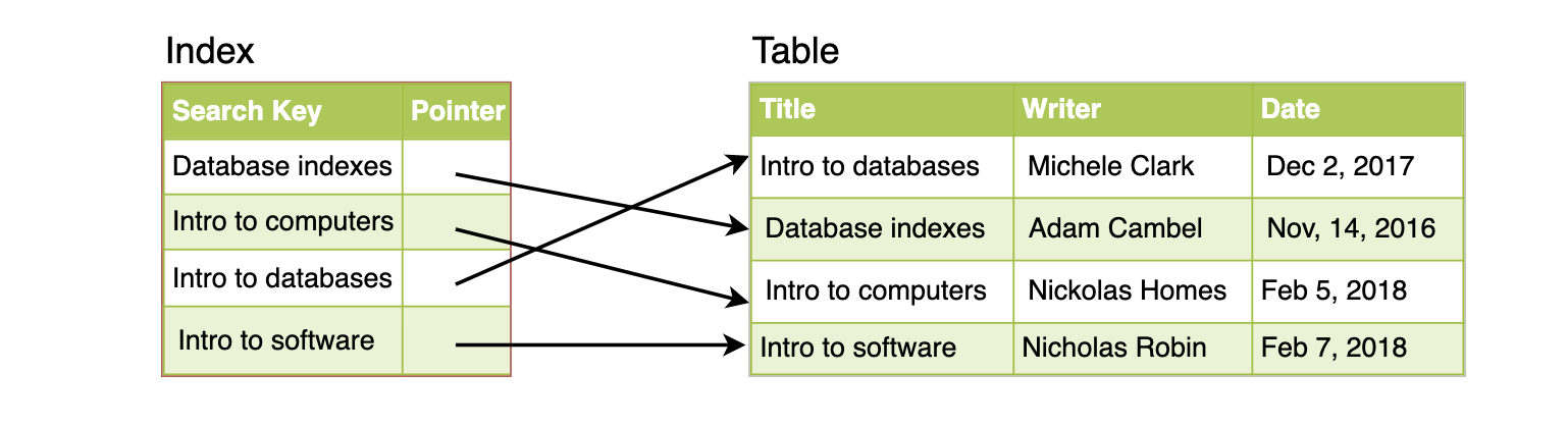 Simply saying, an index is a data structure that can be perceived as a table of contents that points us to the location where actual data lives. So when we create an index on a column of a table, we store that column and a pointer to the whole row in the index. Let’s assume a table containing a list of books, the following diagram shows how an index on the ‘Title’ column looks like: